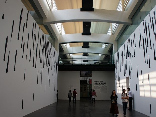 这个是国际有名的雕塑和装置艺术家刘建华为UCCA中心甬道的特殊空间设计、创作的大型陶瓷装置“啸墙”,墙上的墨滴其实是在景德镇制作的陶瓷作品,既像惊叹号,又像雨水,却又跟中国书法产生了联想。用作品的介绍来说,凝固了时间和空间,在一片静默中展开叙述。走在这里,仿佛能够听到自己内心的回声。