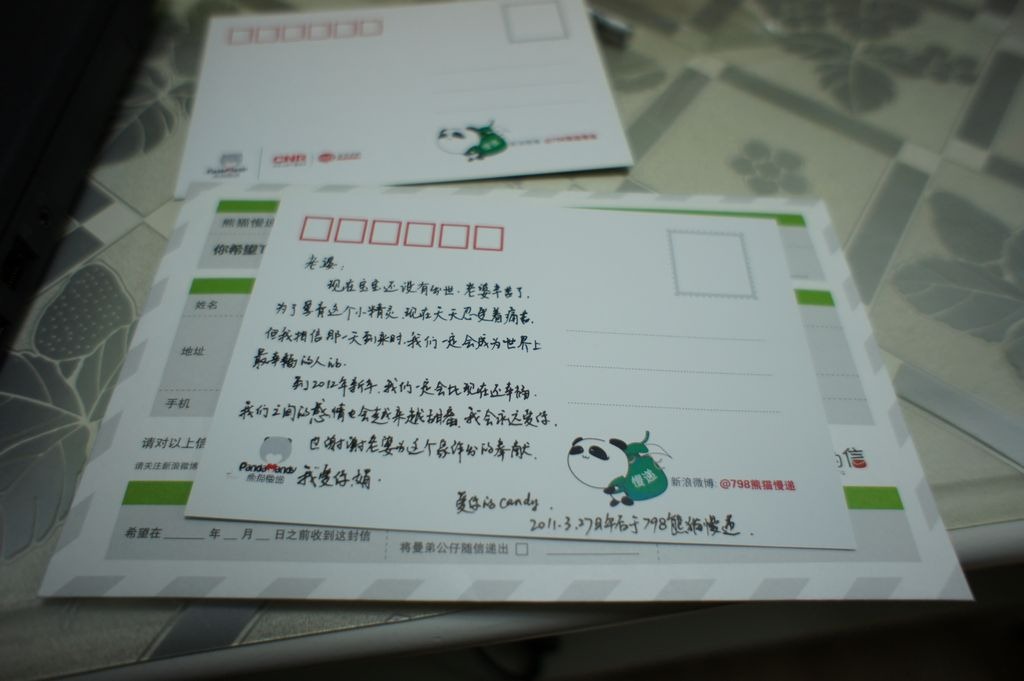 今天去了七九八,又遇到了另一个商店-熊猫慢递。这是个挺有意思的商铺,在这里,你可以写信、写明信片,也可以买礼物或其他一些小东西,但这里还提供另一种服务,所有你购买的商品,都可以在你要求的时间寄出,这个时间,可以是一周,也可以是一个月,甚至十年。