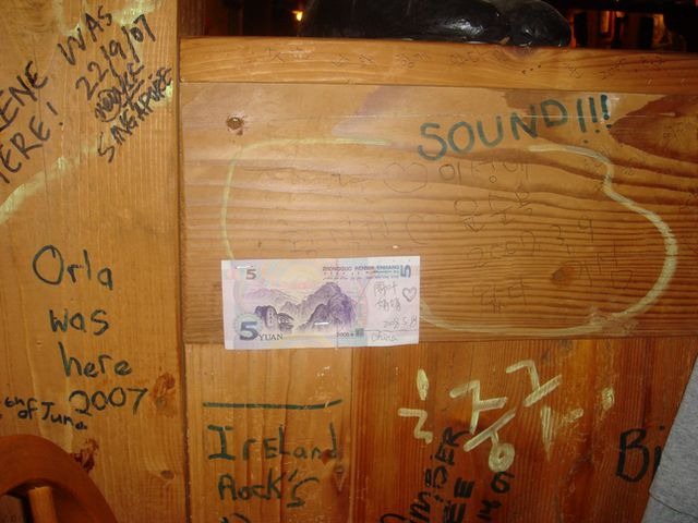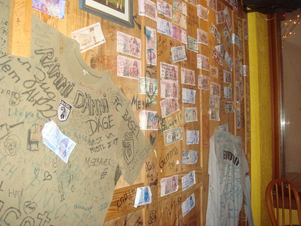 现在还记得在瑞士苏黎世的小餐馆,那天吃的是瑞士有名的巧克力火锅,整个餐馆别有新意的是,墙壁上满是世界各国游人留下的纸币纪念,上面写满了纪念的絮语。我想这个跟国内的猫眼Pizza店有些相似,不过猫眼是直接用记号笔在墙壁上写的,这个则不同,各种纸币,几乎贴满了所有的墙。