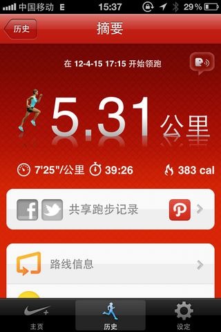每次跑步我都会带上iPhone,打开Nike+,一个人跑的时候还会边跑边听有声书,有《苏菲的世界》、有《跑步圣经》,还有各种管理类书籍(汗)。这次算是破了纪录,跑了5.31公里,折合大学操场上13圈了,不过速度显然是有些慢。