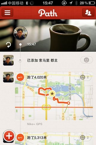 Nike+软件的共享功能,可惜如果国外大多数SNS功能,首先就是链接Facebook和Twitter,活生生把墙内人的SNS乐趣弄没了。不过这次惊奇的发现,居然Nike+能够与Path共享数据,立刻Link上。同样是红色的色调,不过这种LBS应用,也许身边用的人太少,还不如“街旁”或者“大众点评”的签到好玩。第二幅图是万恶的Google地图偏移,在Nike+的网站上,登陆用户打开后,如果切换到卫星图,则没有偏移。