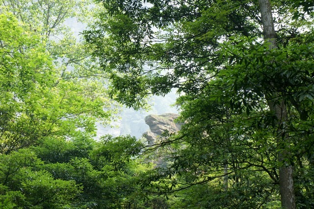 由于树木太过浓密,以至各种山岩风景都得好生调整角度,在树隙间找寻,如这个“双龟探溪”