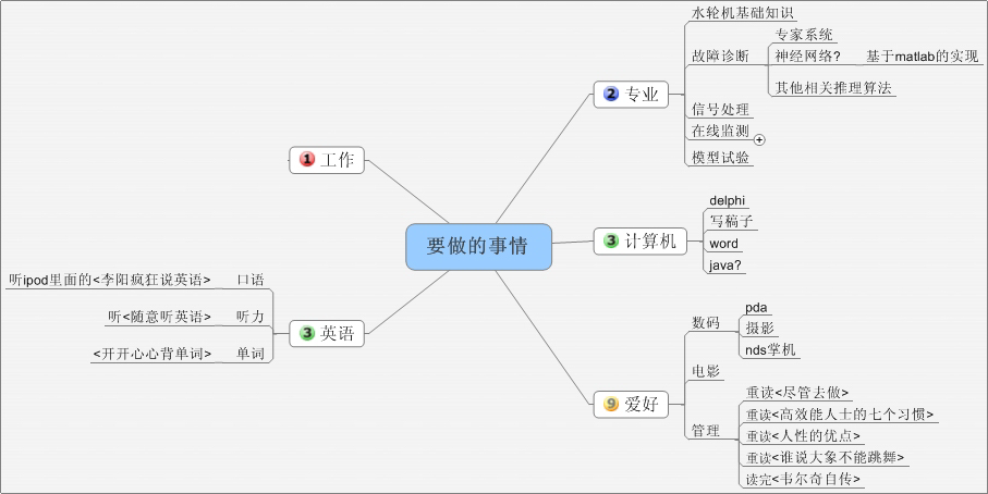 2006.02.11,随笔,马上开始正常的学习生活了,用mindmanager规划了一下 马上开始正常的学习生活了,用mindmanager规划了一下 毕竟精力有限,所以也算是稍稍整理了一下.也不知道是对是错.打问号的都是不确定的,希望能够尽管把里面的问号改成肯定的东西.也希望那个”工作”能够早点从里面消失.当然,过段时间检查一下里面的英语学习状况,尽量不要让自己失望.我希望自己脑子里面少装点东西,把脑袋里的东西都整理出来,然后按部就班的做,这样比较有头绪.算是一次的现实体验了.