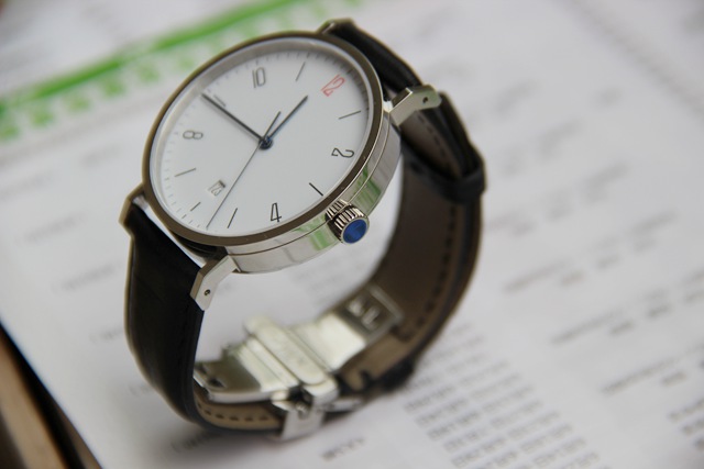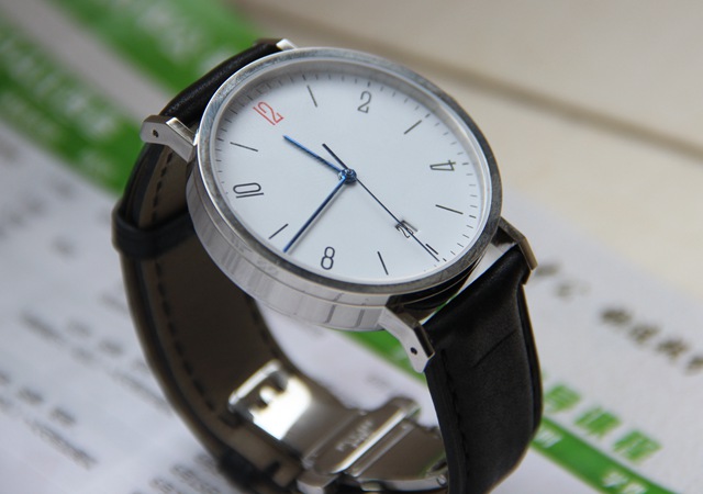 包豪斯风格表盘。取消了任何标识和字样,因为就是定制的产品,所以不希望带上任何山寨或者仿制的名声(实际上还是模仿了NOMOS的风格,这也是自己不太满意的地方,但太多人参与设计,能成功已经不易了)。