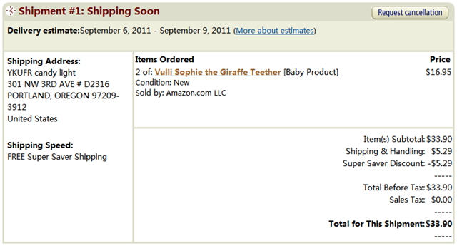 最近开始败家败到美国去了,在Amazon上用双币国际信用卡买了飞利浦的剃须刀,然后看到这个0-12月宝宝玩的长颈鹿玩具,就毫不犹豫的的买了两个,一个送给自己未出生的宝宝,一个打算送给同事的宝宝。虽然价格并不是很贵,但从美国亚马逊到俄勒冈州,再到转运到底特律,再转运到北京,估计邮费也要上百了,不过给自己和别人宝宝的礼物,一定必须是用心的,也必须是实用和特别的。